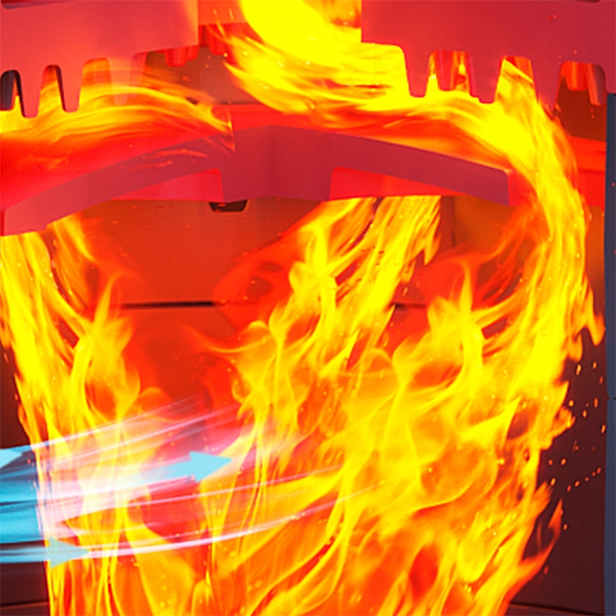 Рассекатель пламени разделяет топку на 2 камеры и заставляет потоки пламени перед выходом в дымоход распределиться по всей поверхности каменки эффективно передавая её энергию от горящих дров.