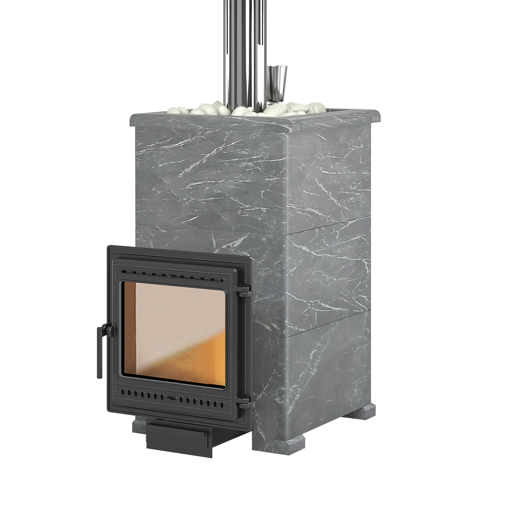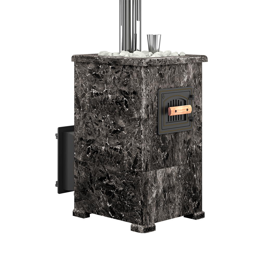 Данную модель печи отличает от аналогов то, что закрытая каменка расположена внутри топки. Это позволяет максимально быстро и хорошо прогревать камни, которые расположены внутри каменки. На камни через специальную трубку с отверстиями поддается вода, которая моментально испаряется, превращаясь в мелкодисперсный пар.