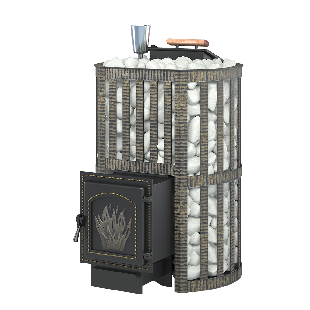 Закрытая каменка изготовлена из особо прочной котловой стали (09Г2С) и вмещает в себя не менее 60 кг камней.
