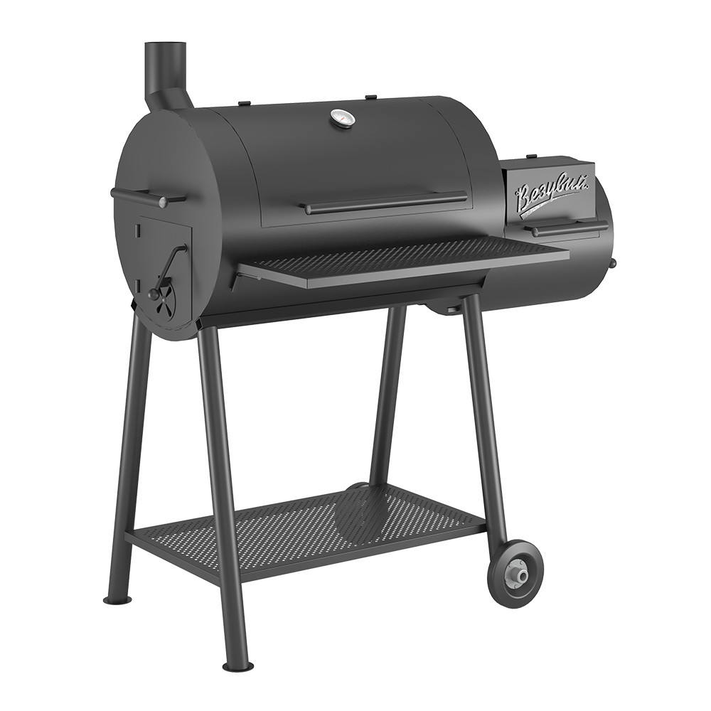 Для удобного использования на передней поверхности смокера сделана съёмная стальная полка для размещения продуктов и посуды. Смокер установлен на подставке с надёжными стальными ножками. В нижней части подставки сделана полка, на которой удобно хранить дрова и инструменты для работы со смокером. Две ножки смокера оснащены колёсами для удобства перемещения изделия по зоне барбекю. Для перекатывания смокера используется ручка на боковой стороне основного модуля смокера.