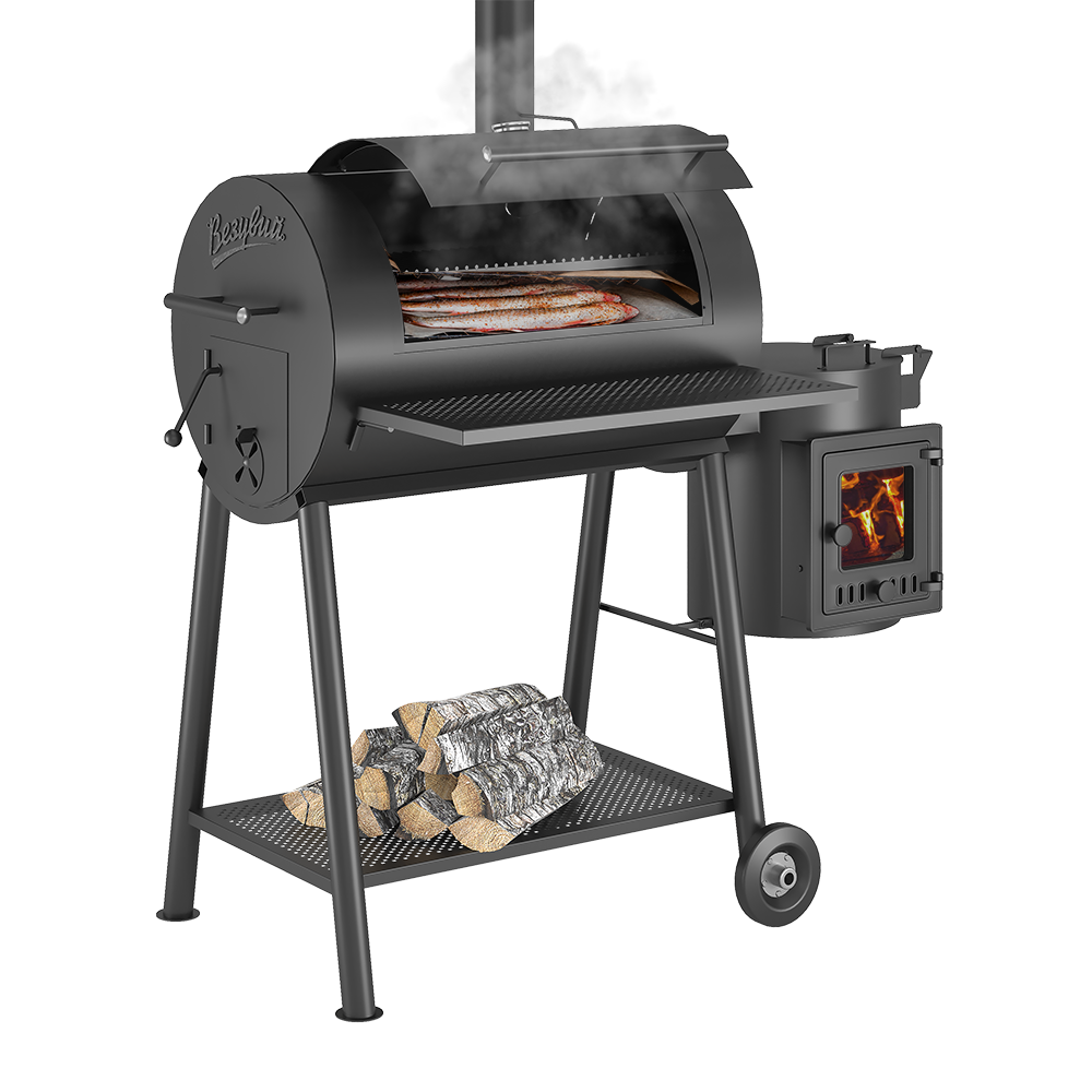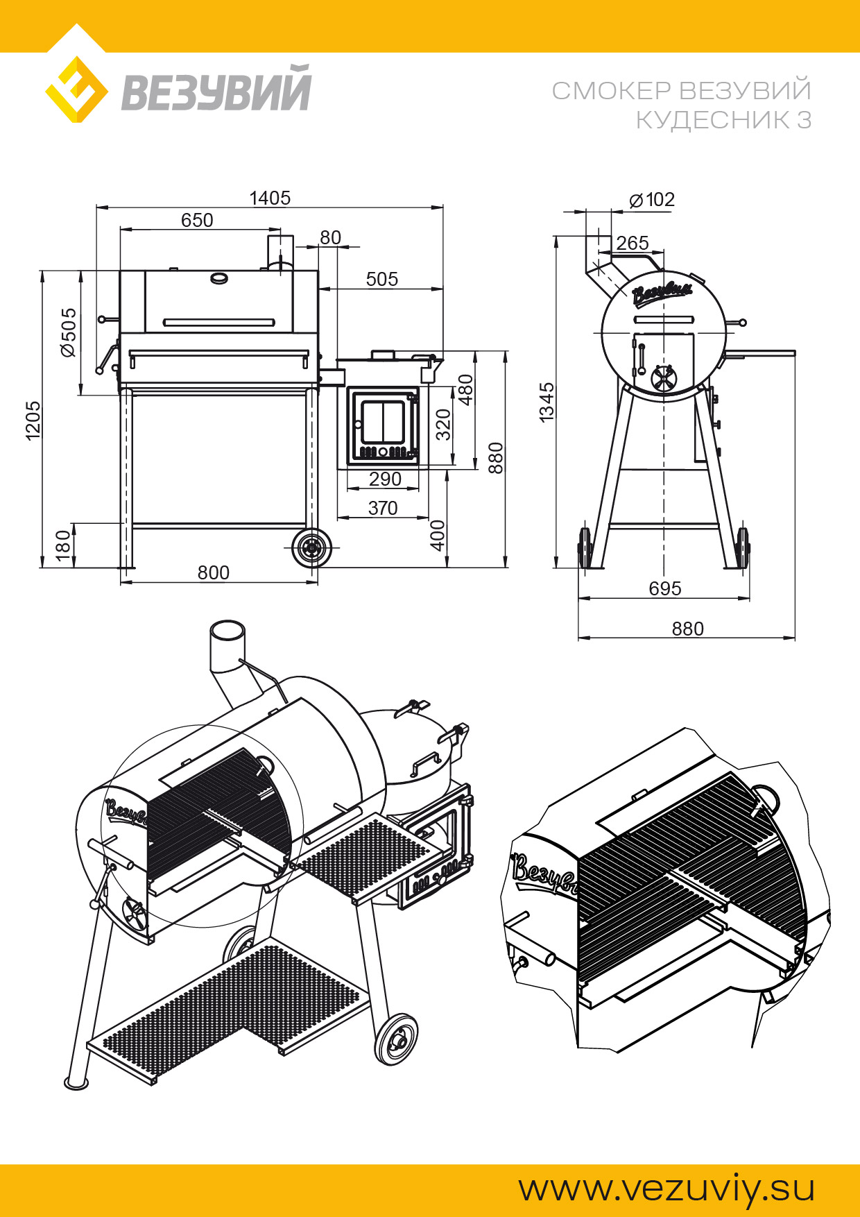 Смокер Кудесник 3 — приспособление для приготовления пищи на открытом огне, сочетающее в своей конструкции барбекю, печь под казан и коптильню. Мангал-смокер используется для приготовления продуктов горячего и холодного копчения в домашних условиях. Материал - особо прочная котловая сталь (09Г2С) толщиной 3 мм.