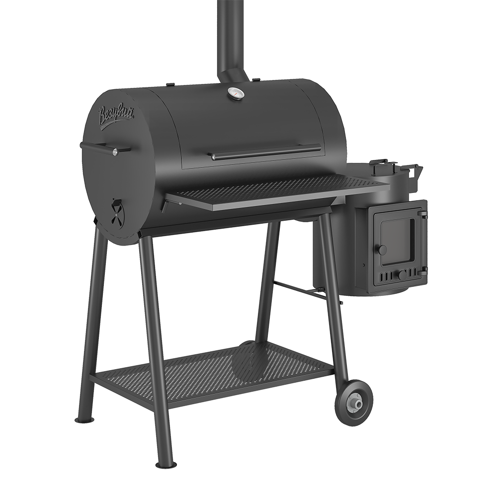 Для удобного использования на передней поверхности смокера сделана съёмная стальная полка для размещения продуктов и посуды. Смокер установлен на подставке с надёжными стальными ножками. В нижней части подставки сделана полка, на которой удобно хранить дрова и инструменты для работы со смокером. Две ножки смокера оснащены колёсами для удобства перемещения изделия по зоне барбекю. Для перекатывания смокера используется ручка на боковой стороне основного модуля смокера.
