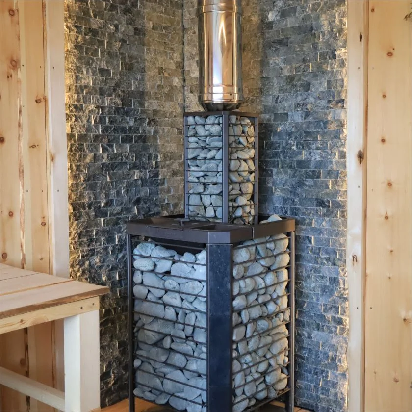 Сетка-каменка защищает от излучения, уменьшая поверхность открытой трубы, снимает тепло с ее стенок и направляет его на прогрев камней.