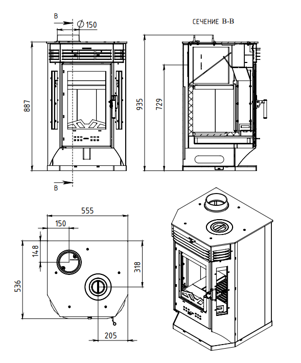 Для печи необходим дымоход диаметром 150 мм. Его можно подобрать в разделе дымоходы. Рекомендуем обратить внимание, что первыми элементами от печи могут быть дымоходы черного цвета из котловой стали,которые можно подобрать в разделе дымоходы КПД