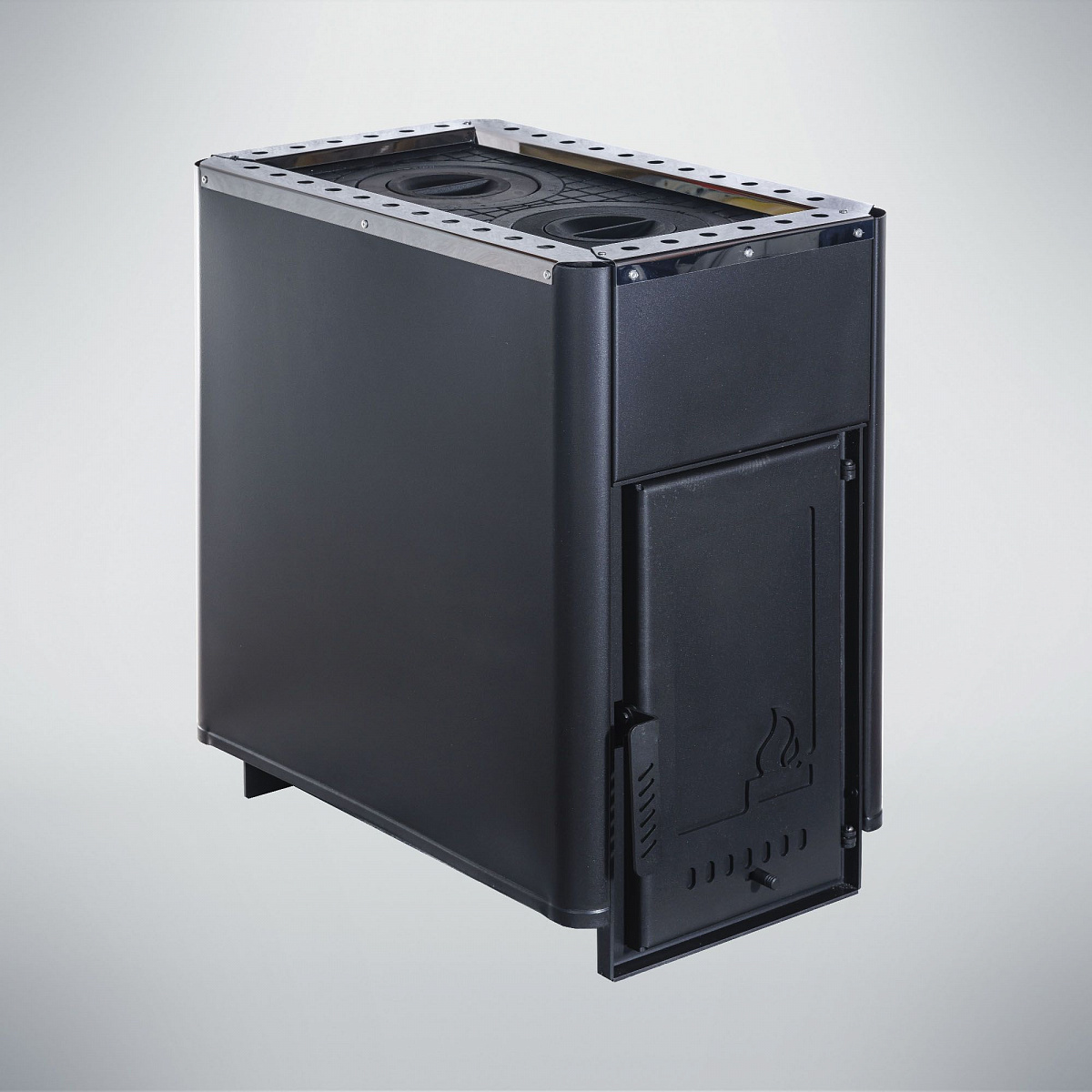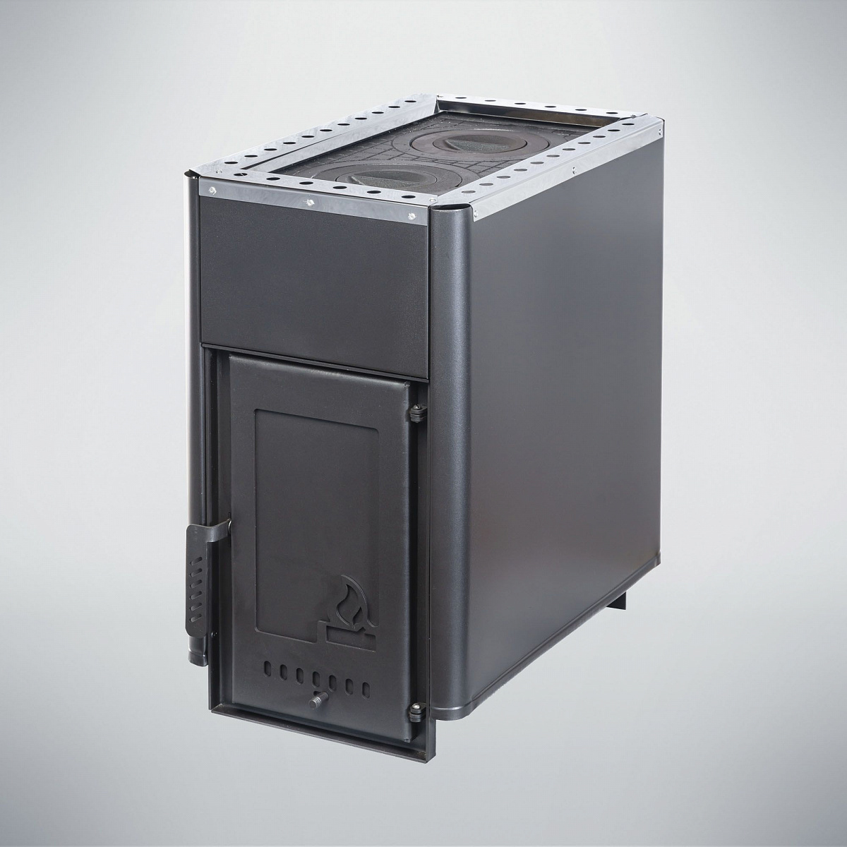 Печь снабжена чугунными конфорками для приготовления пищи. Регулировка интенсивности горения, осуществляется за счет открытия/закрытия зольного ящика, тем самым получая разные режимы теплоотдачи. Колено 90° входит в комплектацию к печи. Топка печи Варвара Уют изготовлена из стали 6 мм, наружный кожух - металлический, препятствует жесткому излучению и позволяет быстро прогреть помещение за счет конвекции. Чугунная дверка проста и надежна в эксплуатации.