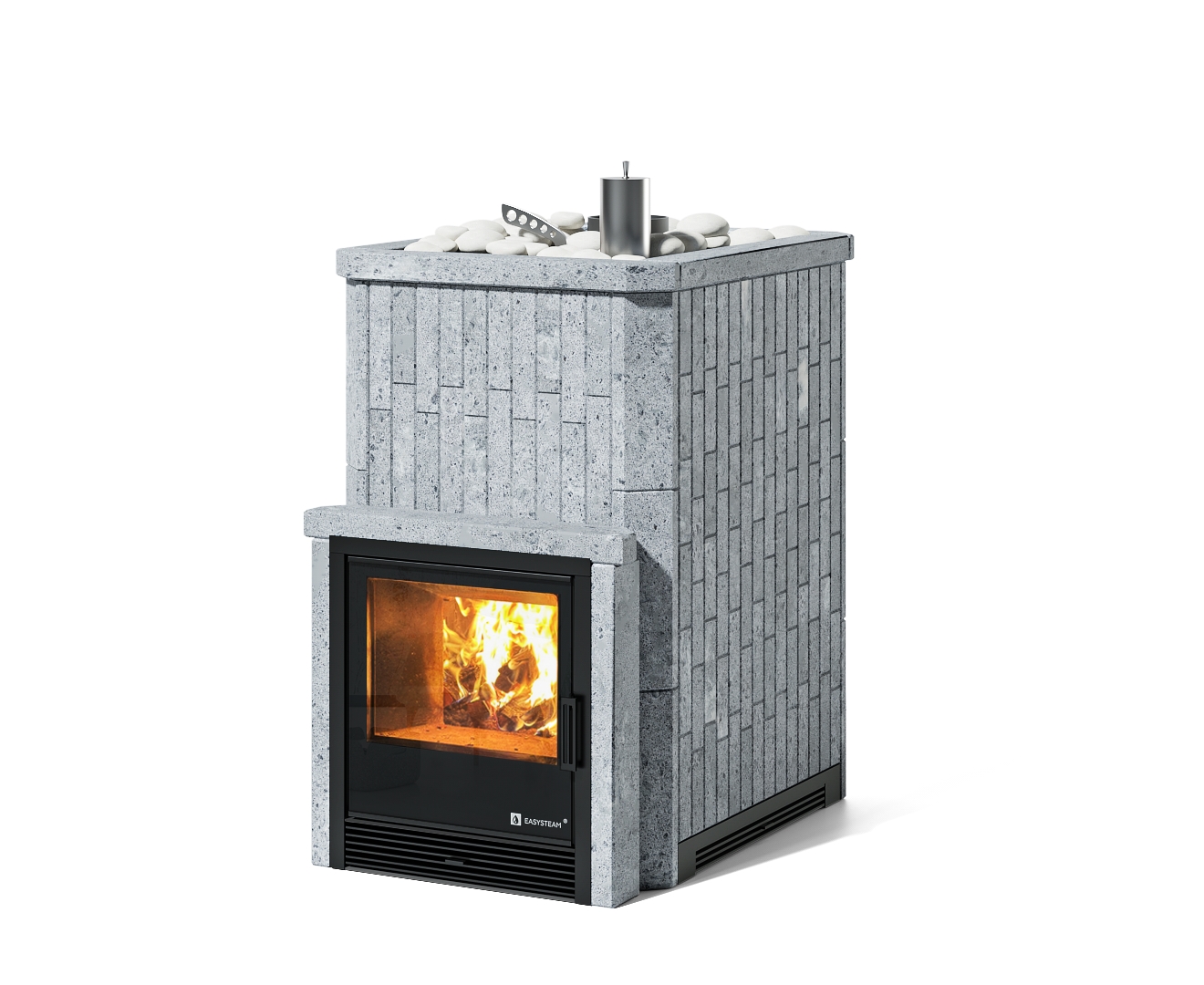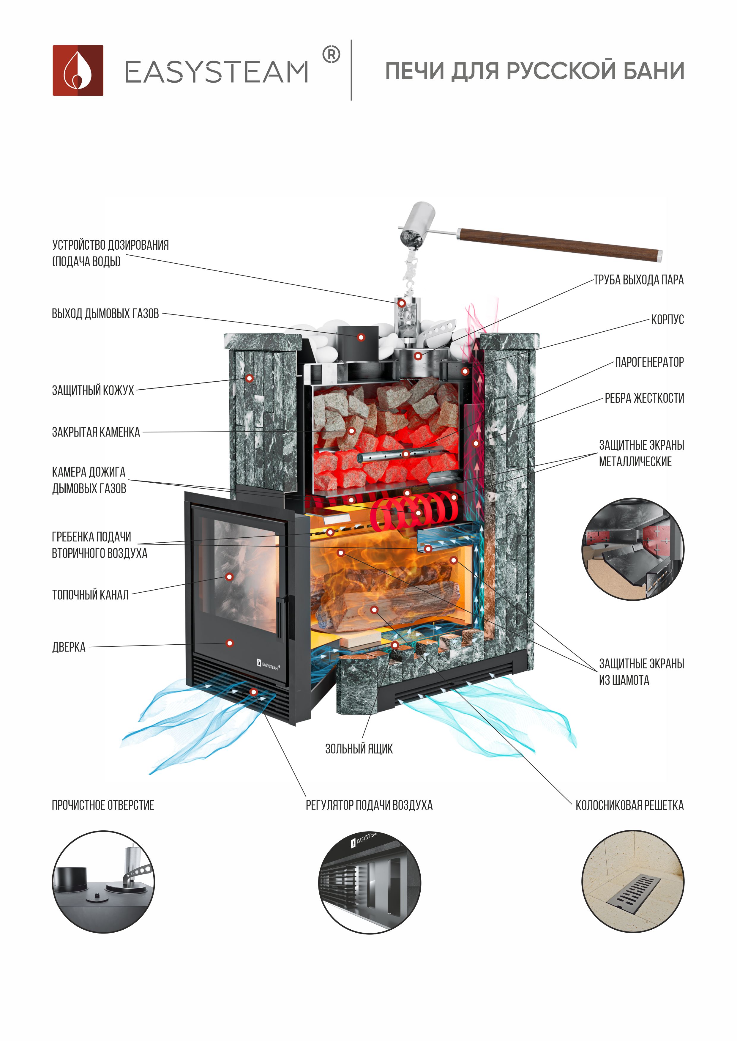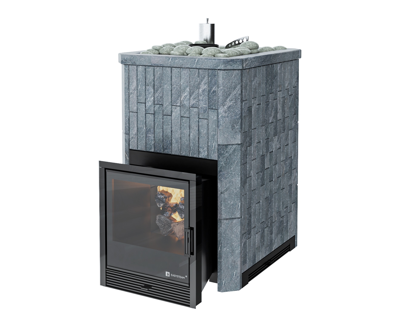 Печи из серии Южная ИзиСтим выполнены из жаропрочной нержавеющей стали AISI 430 3-4 мм. Это практичный и доступный вариант печей для русской бани и сауны. Печь сочетает в себе съемную закрытую и открытую каменку со встроенным парогенератором. Это банная печь с уникальным узлом дожига дымовых газов , который обеспечивает более полное сгорание дров и и, как следствие, снижение расхода дров до 30%. В стандартную комплектацию печи входит индивидуально разработанный кожух из натурального камня толщиной 40 мм с регулируемой конвекцией.