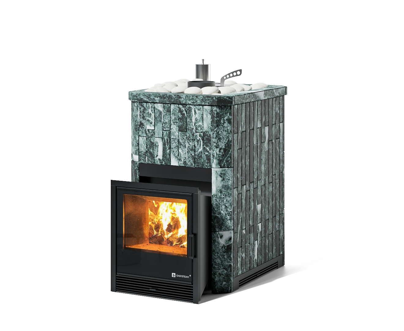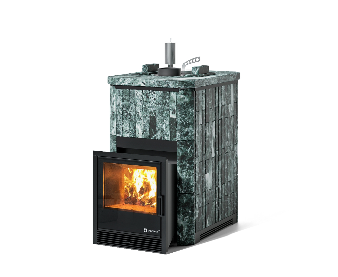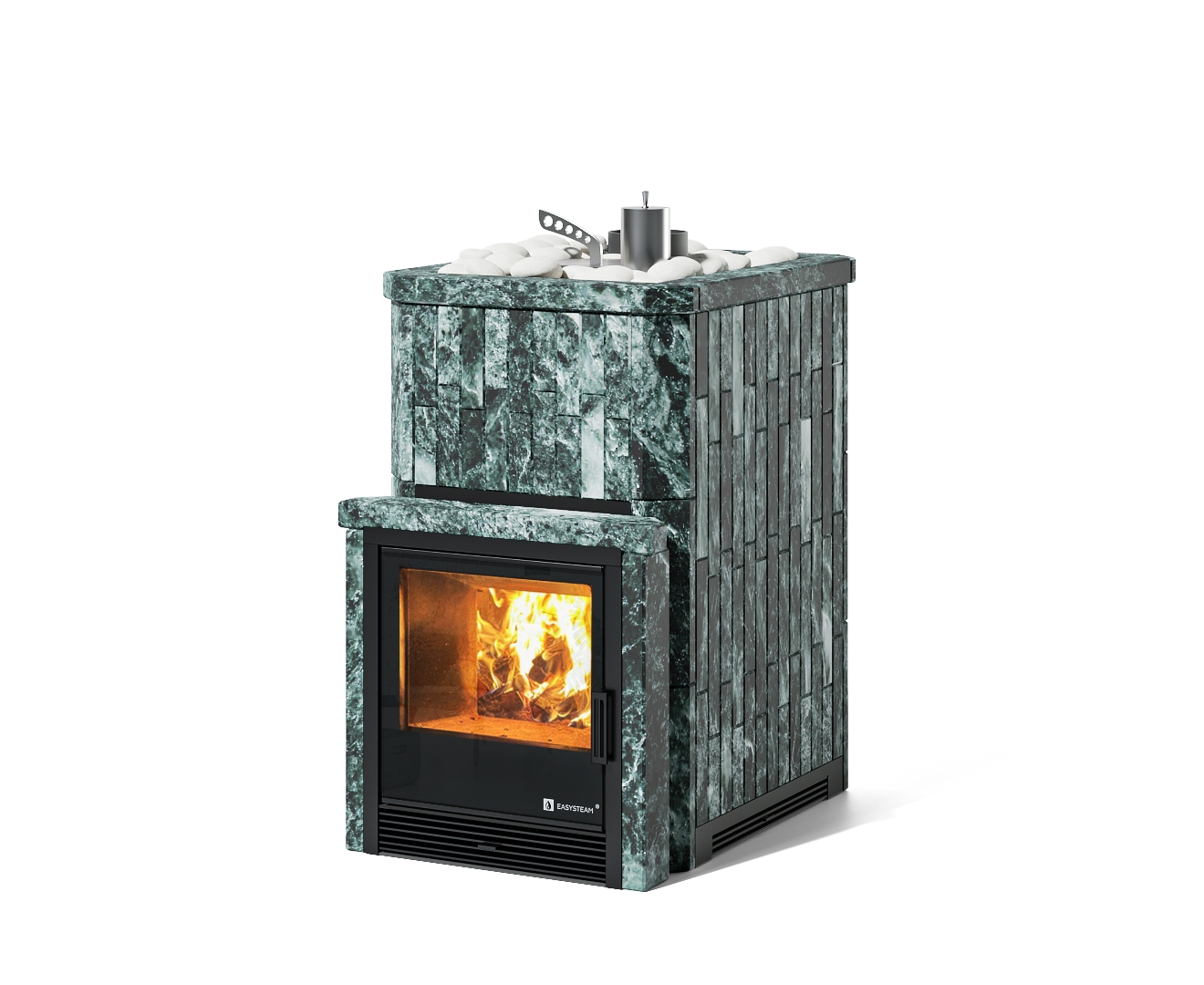 Печи из серии Южная ИзиСтим выполнены из жаропрочной нержавеющей стали AISI 430 3-4 мм. Это практичный и доступный вариант печей для русской бани и сауны. Печь сочетает в себе съемную закрытую и открытую каменку со встроенным парогенератором. Это банная печь с уникальным узлом дожига дымовых газов , который обеспечивает более полное сгорание дров и и, как следствие, снижение расхода дров до 30%. В стандартную комплектацию печи входит индивидуально разработанный кожух из натурального камня толщиной 40 мм с регулируемой конвекцией.
