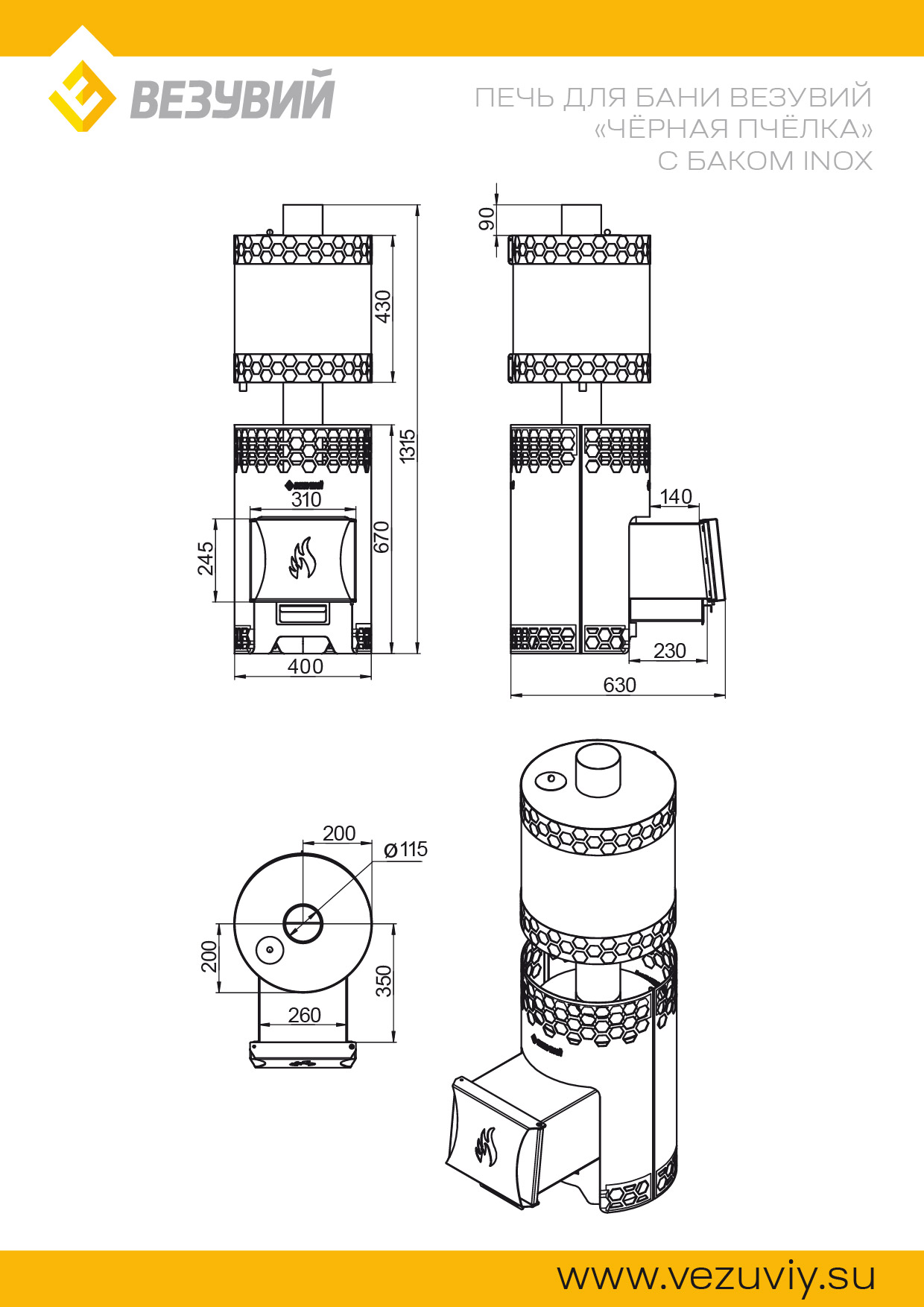 Договор заключается в момент оплаты Покупателем товара ТОЛЬКО в ОФЛАЙН-МАГАЗИНЕ. Делая предварительный заказ, Покупатель заверяет, что ознакомился и согласен с Политикой компании, она ему ясна и понятна.Печь для бани Везувий "Чёрная Пчёлка" с баком Нержавеющая сталь (Inox)