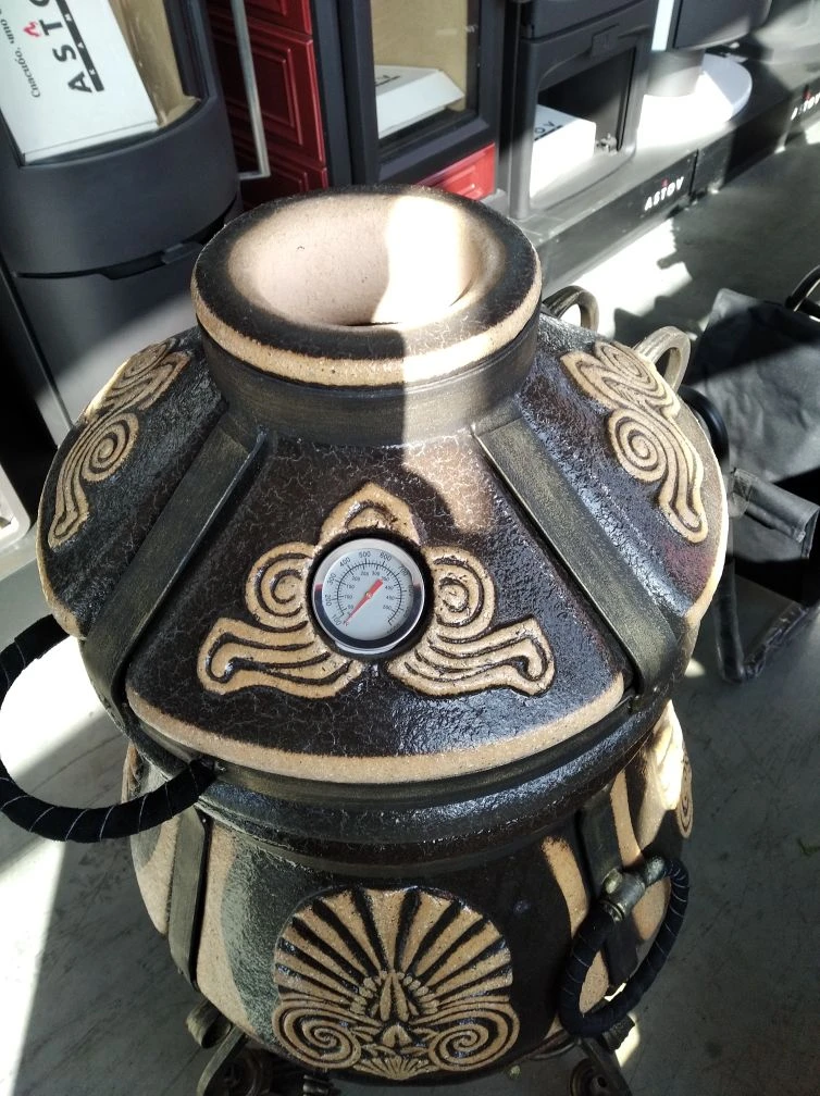 Тандыр сделан из глины и имеет толстые 6-сантиметровые стенки (+/-0,5см), диаметр горловины составляет 28 см, общий диаметр 53 см, рабочая длина шампура 33 см. Все тандыры можно переносить, благодаря удобным боковым ручкам. Тандыр Греческий обладает большой функциональностью, не уступая другим моделям.