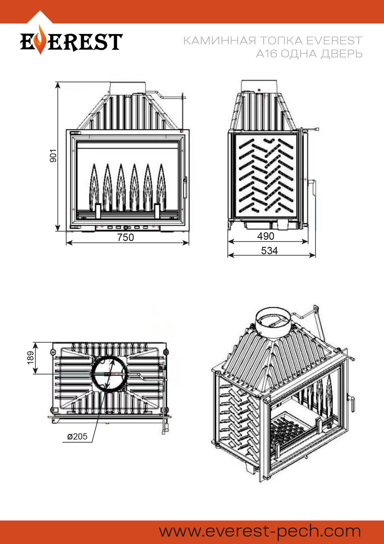 Каминная топка ЭВЕРЕСТ (EVEREST) A16 изготовлена из качественного жаростойкого чугуна (ГОСТ 1412-85) с толщиной стенок 6-10 мм