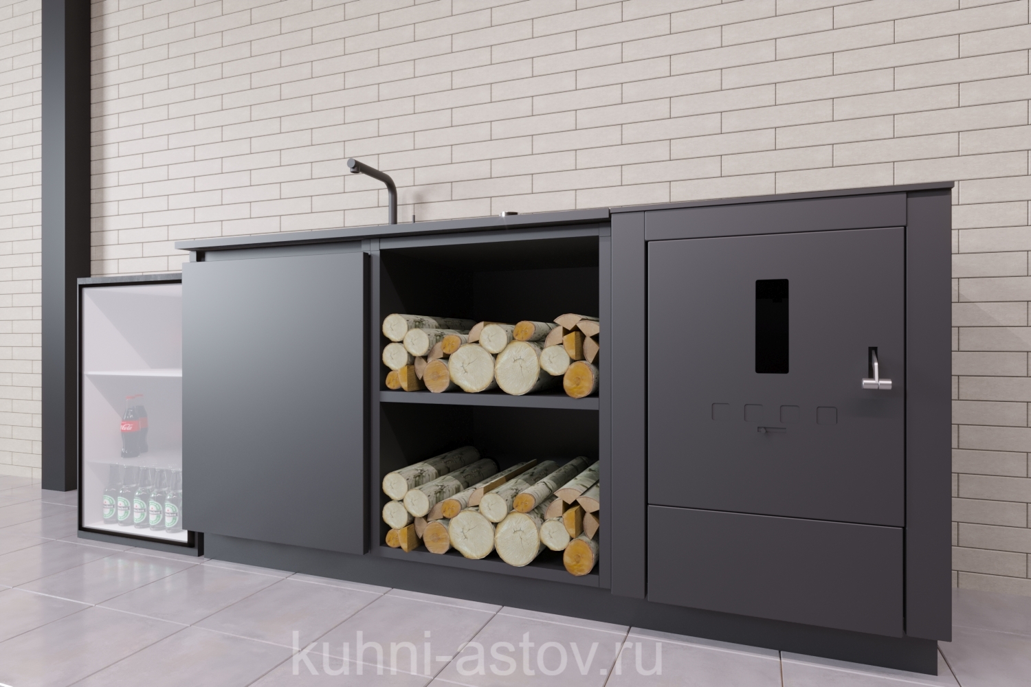 Изготовление корпуса и фасадов из качественной оцинкованной стали толщиной 1 мм, устойчивой к воздействию внешних факторов, обеспечит длительную эксплуатацию. 2-контурные фасады, так же как и корпуса тумб, защищены порошковым покрытием цвета RAL9005, что подчеркивает брутальность этой <a title="зоны барбекю на даче" href="/product-category/zony-barbekju/">зоны барбекю на даче</a>. В качестве дополнения можно установить угольный гриль. Так же вам обязательно надо выбрать и добавить столешницу, мойку и смеситель.