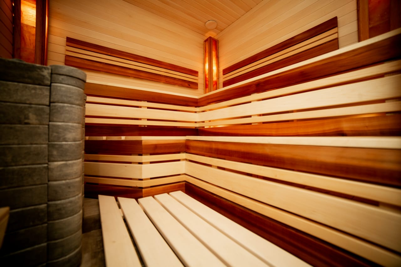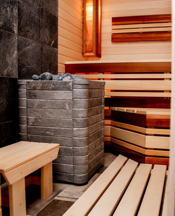- Оригинальный дизайн сауны подчеркивает использование угловых вертикальных абажуров из Гималайской соли.